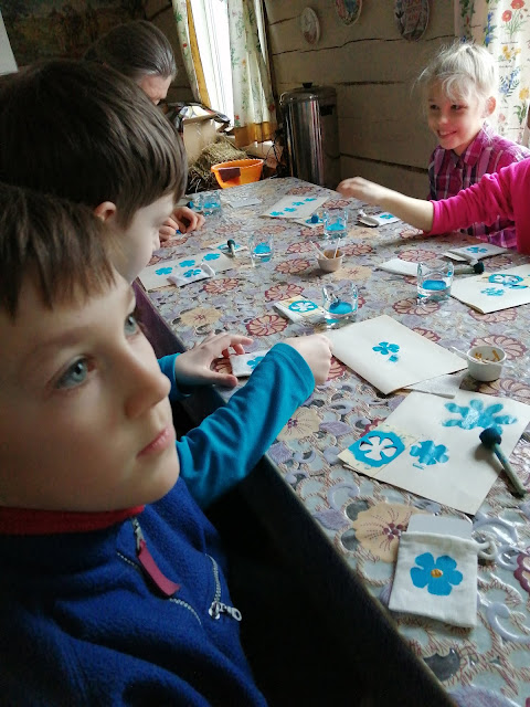 На мастер- классе, с помощью трафарета, изобразили цветок льна на мешочке . В этот мешочек насыпали льняные семечки. Весной посеем ленок у себя на даче.